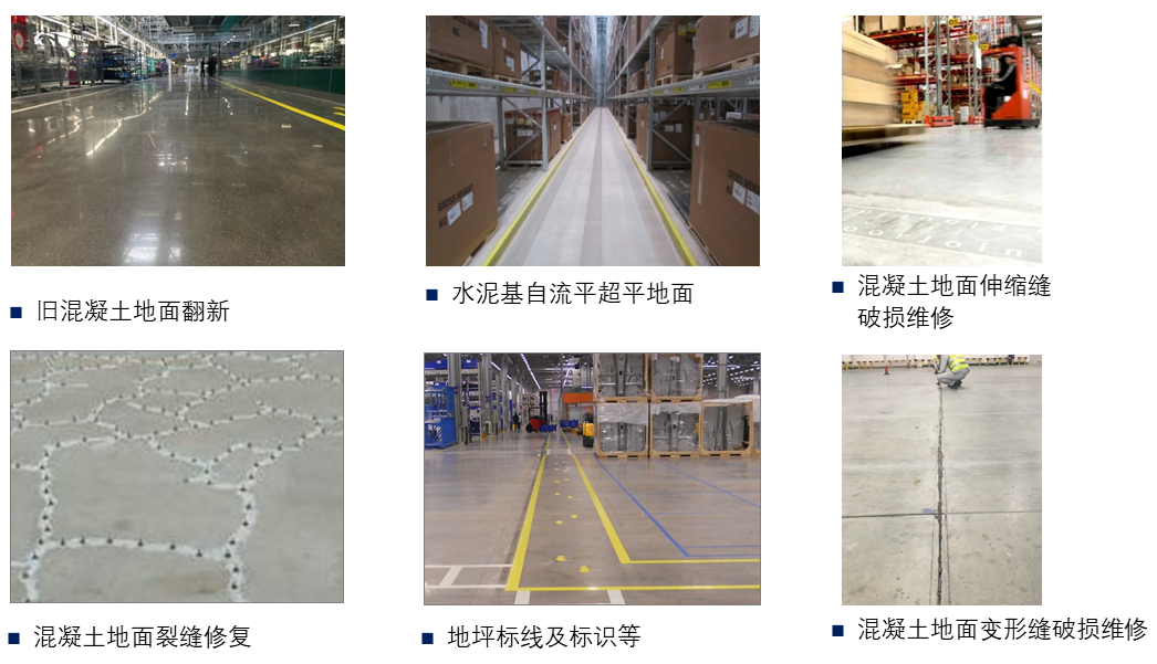 ■ 中和建筑可以提供各种类型的、应用于工业厂房混凝土地坪维护服务。